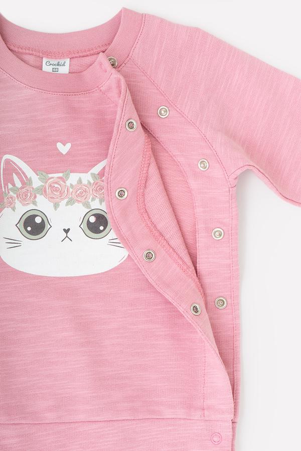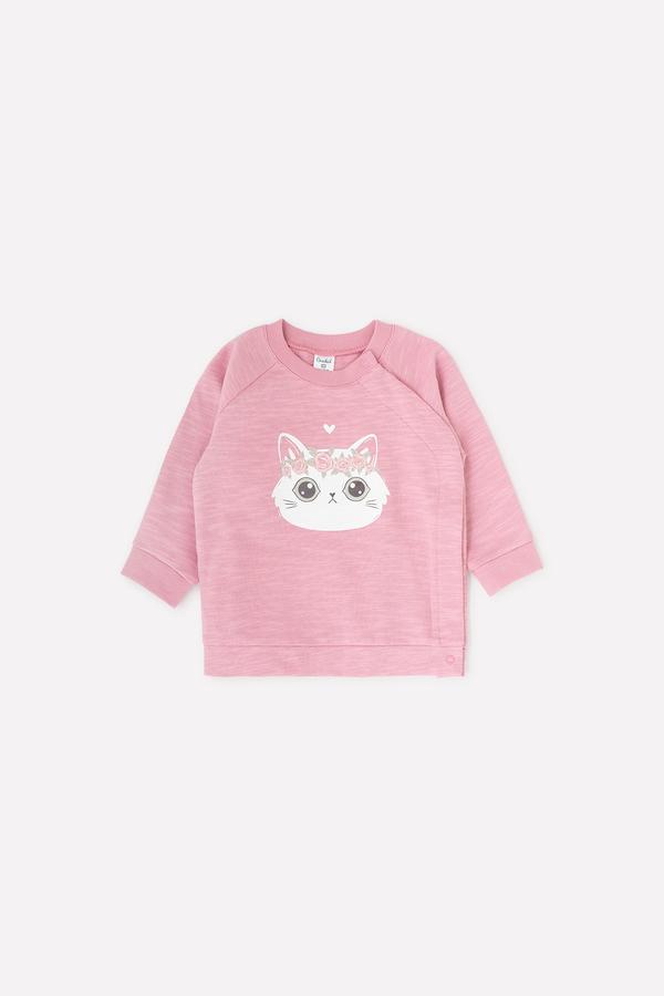 Однотонный джемпер из футера петли с эффектом слаб. Украшен крупным принтом на груди. Длинные рукава-реглан оканчиваются эластичными манжетами. Внизу - мягкий пояс. Застёгивается на потайные кнопки спереди сбоку.