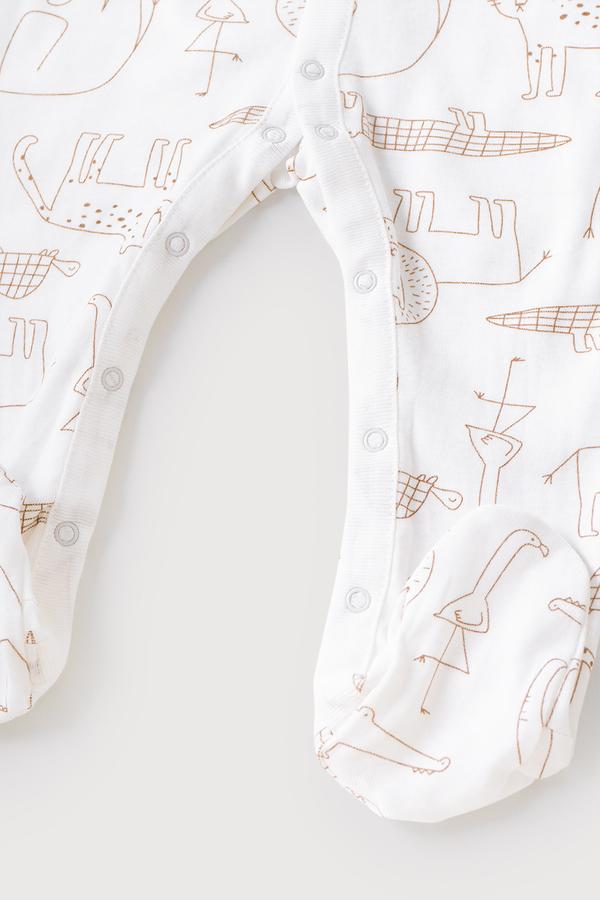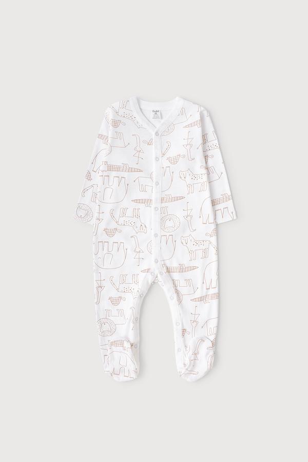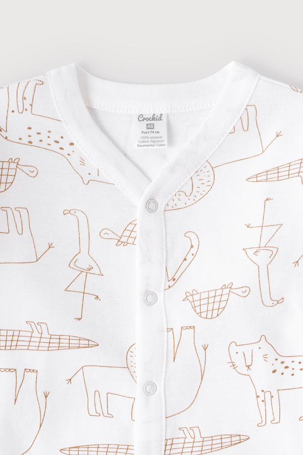 Комбинезон для новорожденных из мягкого, эластичного трикотажа - рибаны, произведенного из натурального хлопка. У изделия застежка на кнопки. В 56 размере на рукавах предусмотрены антицарапки, швы выполнены наружу. Оригинальная набивка выполнена из стойких, гипоаллергенных текстильных красителей. Все трикотажные полотна производятся в соответсвии с нормами Швейцарского сертификата ЭкоТекс.