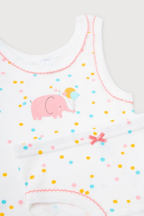 Комплект для девочки - майка на лямках и трусы из натурального хлопка. Сшит из эластичного материала рибана пенье. Набивной рисунок на майке, принт в области груди. Горловина и проймы обработаны бейкой. Бантик на трусиках.