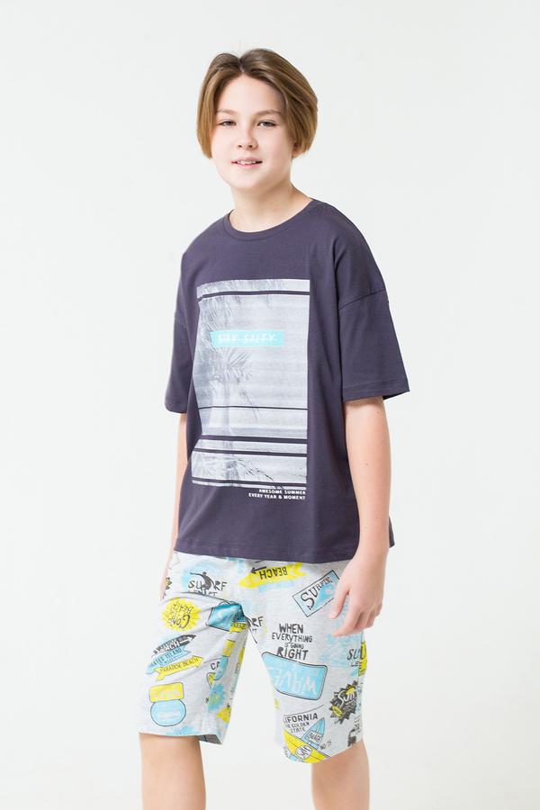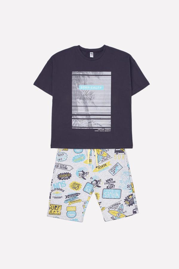 Пижамный комплект из хлопкового трикотажа супрем. Однотонная футболка с короткими рукавами со спущенным плечом. Спереди принт. Шорты из меланжевого супрема с набивным рисунком. Пояс с плоской резинкой внутри и утяжкой на репсовую ленту. Боковые карманы.