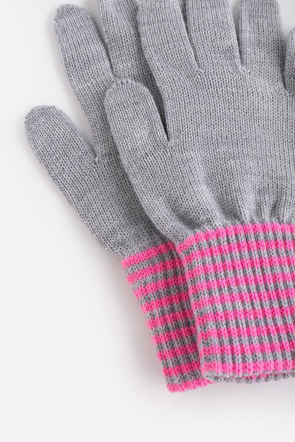 Вязаные перчатки из акриловой пряжи светло-серого цвета с мягкими полосатыми манжетами. Широкие манжеты крепко фиксируют перчатку на руке.