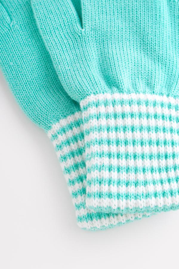 Вязаные перчатки из акриловой пряжи бирюзового цвета с мягкими полосатыми манжетами. Широкие манжеты крепко фиксируют перчатку на руке.