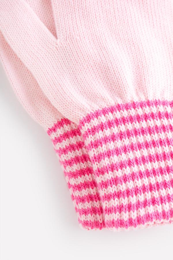 Вязаные перчатки из акриловой пряжи персикового цвета с мягкими полосатыми манжетами. Широкие манжеты крепко фиксируют перчатку на руке.