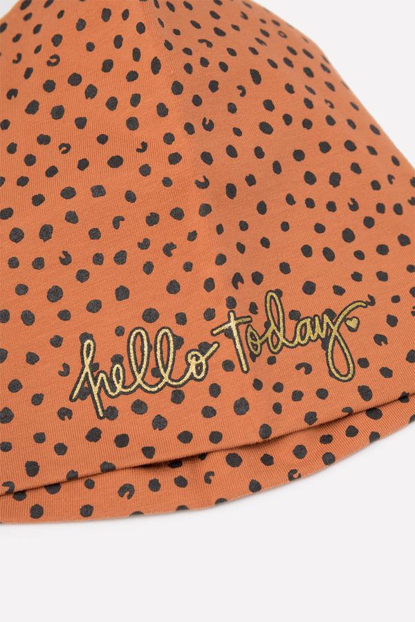Шапка для девочки миндального оттенка с набивными пятнышками. Выполнена из трикотажа супрем с эластаном. Украшена принтом с надписью.