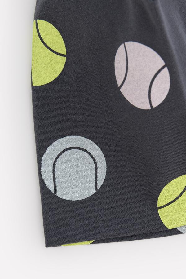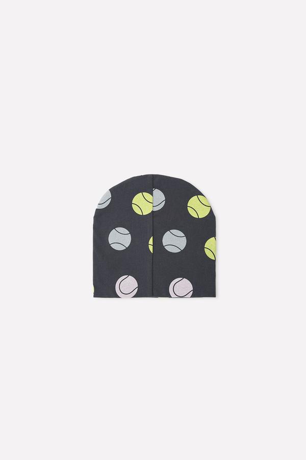 Тёмно-серая шапочка с набивным принтом. Выполнена из трикотажа супрем с эластаном.