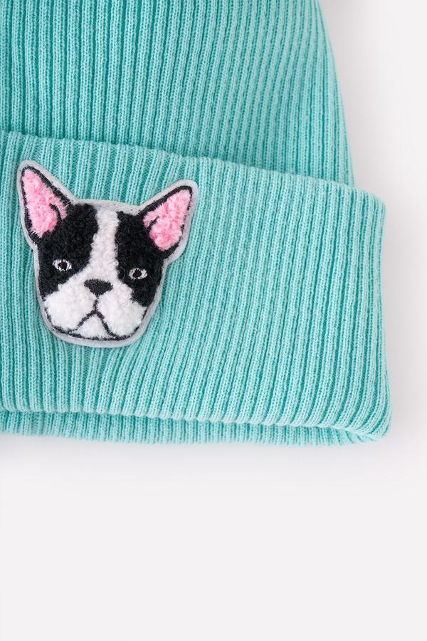 Двойная шапка из акриловой пряжи бирюзового оттенка. На широком отвороте - нашивка в виде собачьей мордочки.