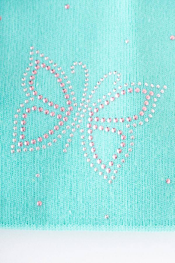 Шапка из акриловой пряжи бирюзового оттенка с внутренним отворотом. Украшена аппликацией из страз в форме бабочки.