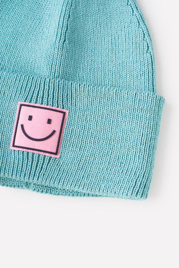 Двойная шапка из хлопковой пряжи. Широкий отворот украшен нашивкой с изображением забавной мордочки.