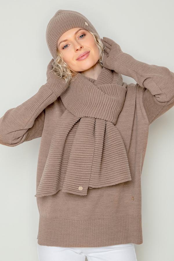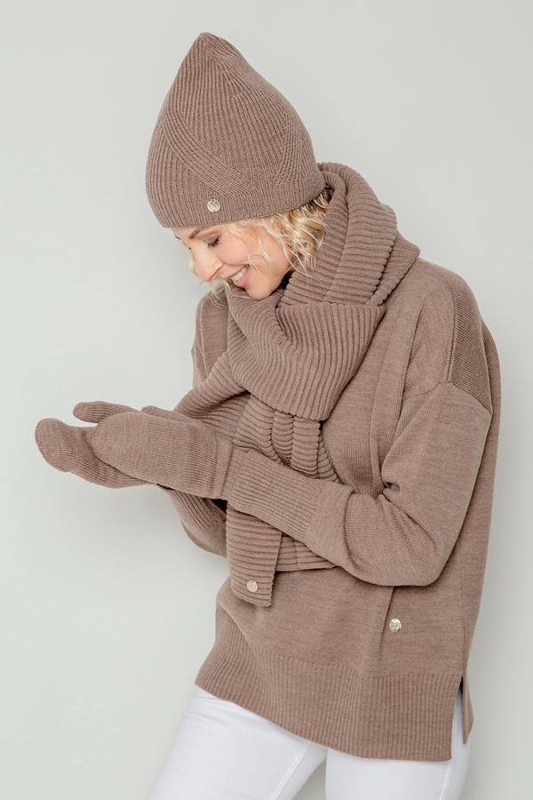 Эластичная вязаная шапка из полушерстяной пряжи, в составе которой шерсть австралийского мериноса. Выполнена переплетением в виде широкой резинки. Шерсть в составе сохраняет тепло, а волокна акрила придают изделию мягкость и объем. Базовый цвет идеально подходит к любой верхней одежде.