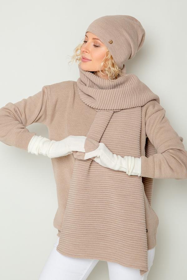 Уютная вязаная шапка из полушерстяной пряжи, в составе которой шерсть австралийского мериноса . Выполнена переплетением гладь. Шерсть в составе сохраняет тепло, а волокна акрила придают изделию мягкость и объем