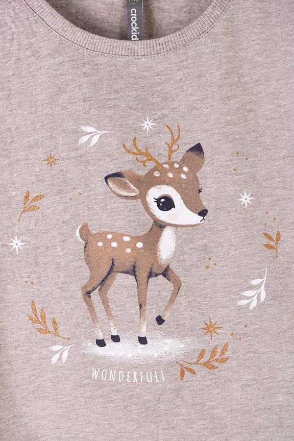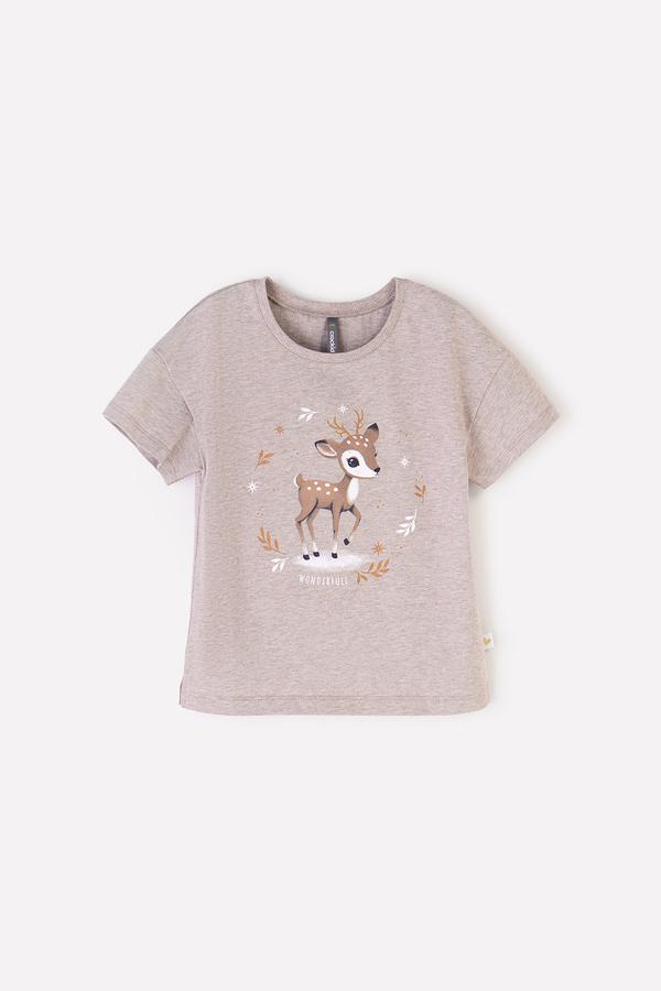 Трикотажная футболка для девочки из меланжевого натурального хлопка. У изделия свободные рукава, спущенные плечи, в боковых швах небольшие разрезы. Для удобства в размерах 92 и 98 имеется застежка на кнопки на спинке. Оригинальный принт выполнен из стойких текстильных красителей. Футболка сохраняет цвет и форму после многократных стирок.