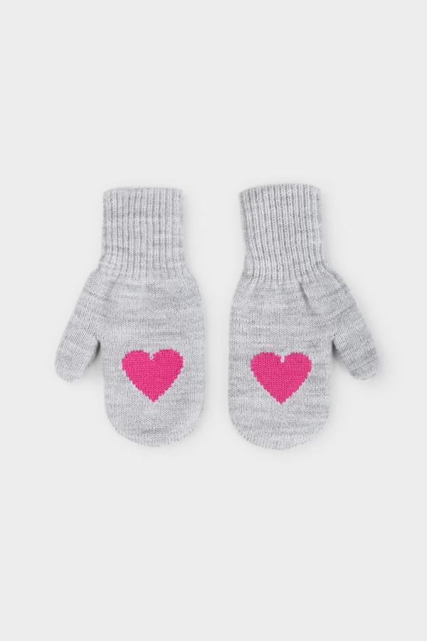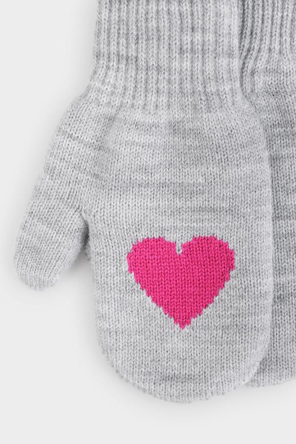 Однотонные варежки из полушерстяной пряжи. Украшены вывязанным рисунком с изображением сердечка. Широкие манжеты крепко фиксируют рукавицы на запястье.